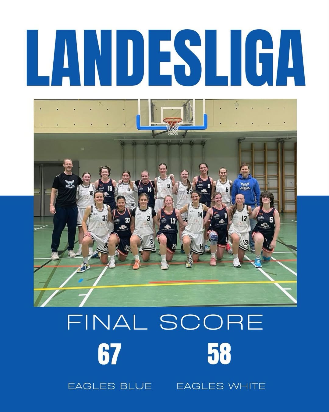 Im zweiten Eagles internen Duell mussten die Eagles 2 stark dezimiert antreten. Trotz nur 7 gesunder Spielerinnen war es eine flotte und ausgeglichene Partie mit einigen Führungswechsel. Den winning Run der Einser Mannschaft musste aber die Starting 5 der 2.Bundesliga kurz vor Ende der zweiten Halbzeit hinlegen. In der zweiten Halbzeit konnten wir uns zwar wieder Punkt für Punkt heranarbeiten aber um die Eagles 1 ernsthaft zu gefährden reichte es dann nicht mehr.